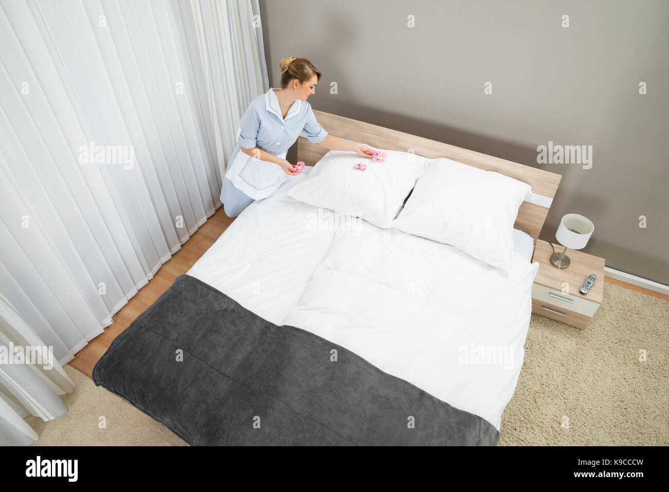 Young Maid Decorating Bedroom With Petals Of Hotel Room